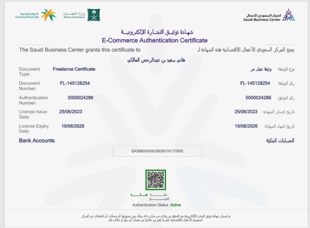 نوع الوثيقة: وثيقة عمل حر (توثيق التجارة الإلكترونية)